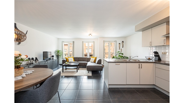 Een mooi afgewerkt appartement op de eerste verdieping bestaande uit een woonkamer, ingerichte keuken, 2 slaapkamers, badkamer, wasplaats, ruim terras, overdekte autostaanplaats, lift.