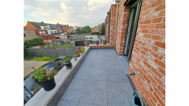 Een nieuwbouwappartement bestaande uit een woonkamer met open, ingerichte keuken, 1 slaapkamer, badkamer, bergplaats, terras.